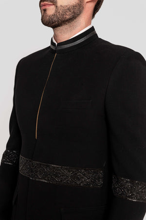Bandgala crafted with exquisite hand-embroidered zardozi detailing embellished with sequience and beads work on the sleeves and waist. The sleek silhouette is accentuated by a subtle gold zip, adding a touch of contemporary elegance.1. Fabric: Bandgala in imported fabric paired with a shirt cotton and pants in cotton lycra.2. Colour: Bandgala and pants in black.3. Model Height: 6.2 feet wearing size 'M'