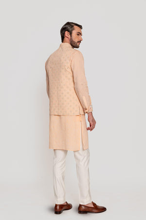 Fabric Quality | Bundi and kurta in linen paired with trousers in cotton lycra | Color | Bundi & Kurta in Peach and pants in Ivory |