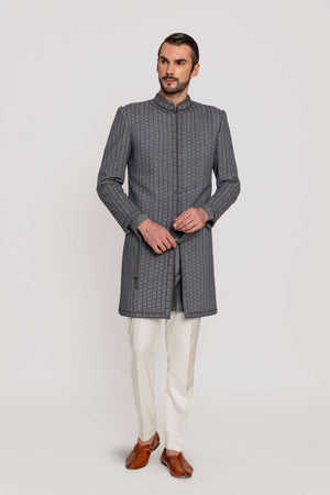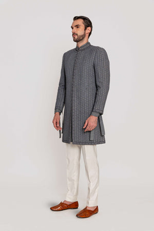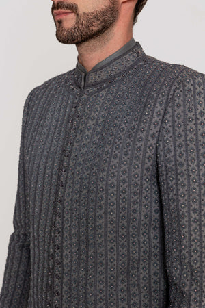 Elevate your occasion wear with this deep midnight blue Indo western jacket, a masterpiece of refined elegance. Features embellish sequince with aari and zardozi hand work on the shoulder, blending traditional craftsmanship with a modern edge. 1. Fabric: Imported paired with kurta and pants in katan silk. 2. Colour: Indo & Kurta Midnight Blue Pants in Ivory 3. Model Height: 6.2 feet wearing size 'M' - Components: 3 pcs