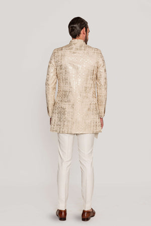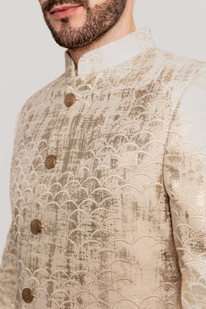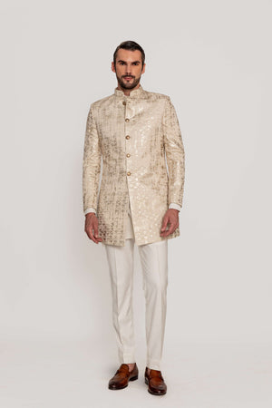 A Suri masterpiece of refined craftsmanship. Made from luxurious fabric, this ensemble is adorned with exquisite aari work, a tribute to India's regal heritage. Gold leaf printing has been done on the sherwani1. Fabric: Luxurious blended fabric paired with kurta and pants in katan silk 2. Colour: Indo, Kurta and pants in Ivory. 3. Model Height: 6.2 feet wearing size 'M' - Components: 3 pcs