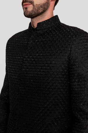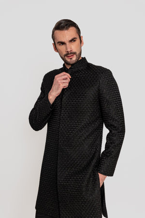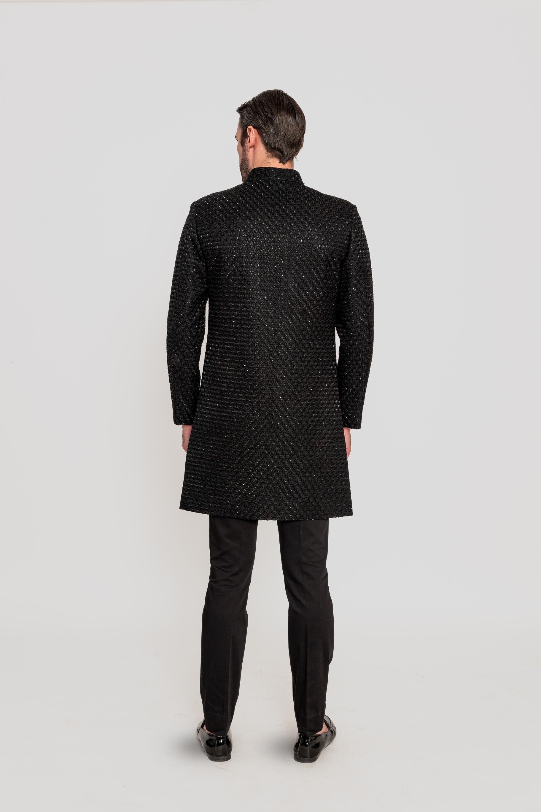 A SURI timless open jacket for the modern gentleman, is a fusion of regal elegance and contemporary styling. Crafted in a luxurious imported fabric, with hand-sewn sequin detailing. creating a refined yet striking look. 1. Fabric: Indo in an imported fabric paired with kurta and pants in katan silk. 2. Colour: Indo & Kurta in Grey and pants in Ivory.3. Model Height: 6.2 feet wearing size 'M' - Components: 3 pcs
