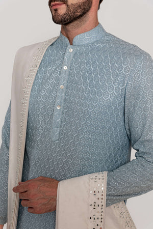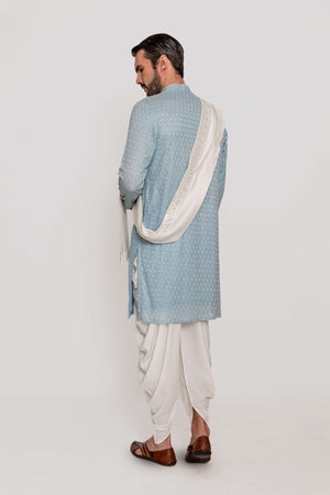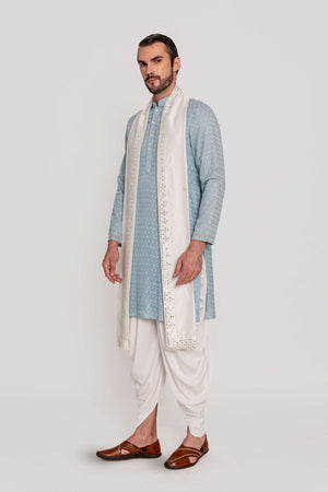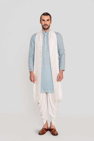 A refined Suri kurta, crafted with delicate all-over aari work mughal motifs, inspired by the timeless handloom traditions of India paired with a stole embellish mirror work embroidery.Fabric: Kurta in georgette / Stole in Chanderi Silk/ Dhoti in Viscose. Components: 2 Pcs