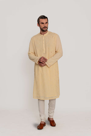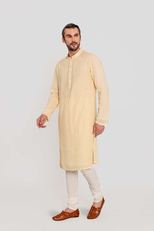 An epitome of grace and refinement, delicate georgette in a soothing pastel hue. The intricate tonal thread aari embroidery forms an elegant all-over pattern, lending it a timeless charm.Fabric: Kurta in Viscose silk / Chididar in cotton. Components: 2 Pcs