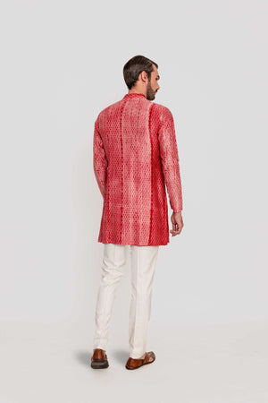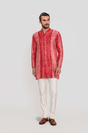 A timeless classic, button down kurta in a radiant shade of red features a contemporary geometric pattern with an ombré fade effect. Fabric: Kurta in Viscose silk / Pants in Kantha silk.Components: 2 Pcs