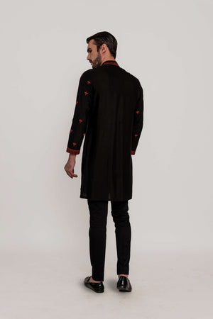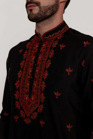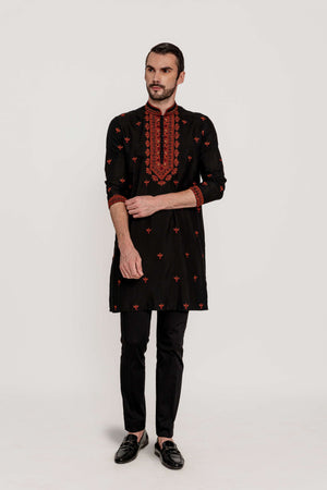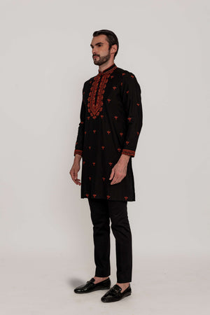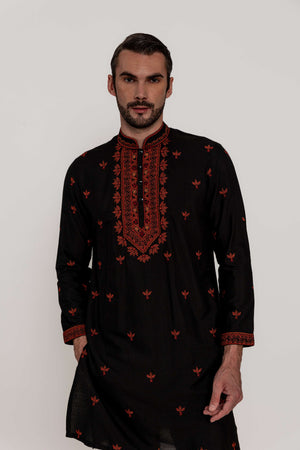 A statement of timeless elegance, this features intricate Kashmiri-style embroidery in a striking shade of rust and red. The handcrafted threadwork on the neckline and cuffs exudes sophistication.Fabric: Kurta in Viscose silk / Pants in Kantha silk.Components: 2 Pcs