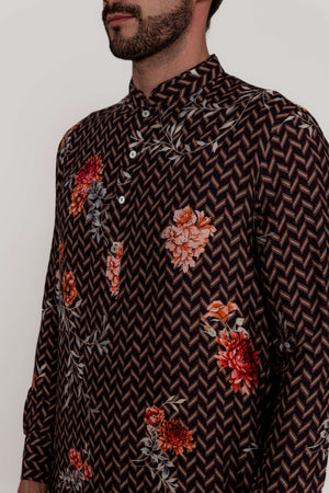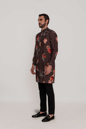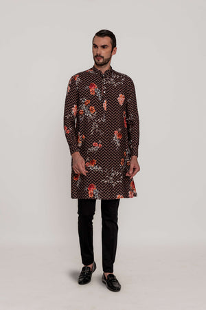 A classic SURI kurta, handcrafted with an exquisite blend of geometric and floral prints. and The kurta is paired with a cotton lycra trouser. The deep chocolate brown base is adorned with a contemporary chevron pattern, complemented by delicate floral accents in shades of red and ivory.Fabric: Kurta in Viscose silk / Pants in Kantha silk. Components: 2 Pcs