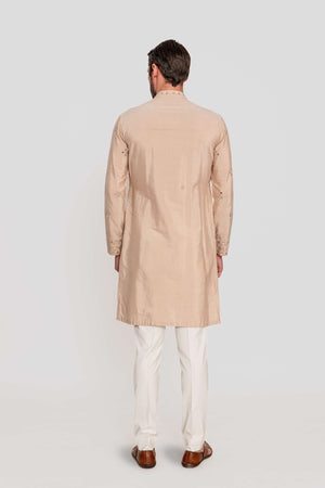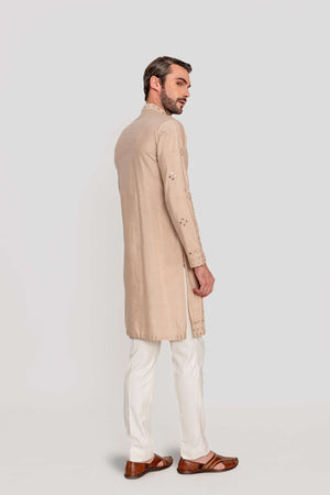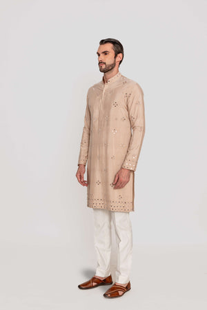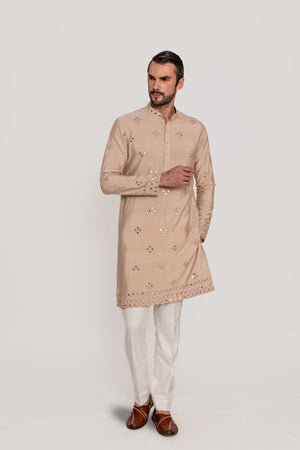 Elevate your festive wardrobe with this elegant classic kurta, intricately adorned with mirror work embroidery for a refined yet understated appeal.Fabric: Kurta in Kantha silk / Pants in Kantha silk.Components: 2 Pcs