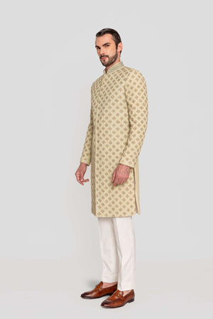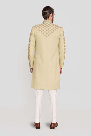 A timeless Suri sherwani, meticulously crafted in georgette , featuring a delicate gold zardozi jaal that exudes understated luxury. The intricate motifs are inspired by the Mughal era’s geometric patterns, lending an air of regal sophistication, 1. Fabric:Sherwani fabric in georgette paired with kurta and pants in katan silk. 2. Colour: Sherwani in Pista, kurta and and pants in Ivory.3. Model Height: 6.2 feet wearing size 'M'-Components: 3 pcs