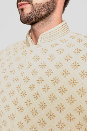 | Fabric Quality | Sherwani fabric in georgette paired with kurta and pants in katan silk | Color | Sherwani in Pista, kurta and and pants in Ivory. |